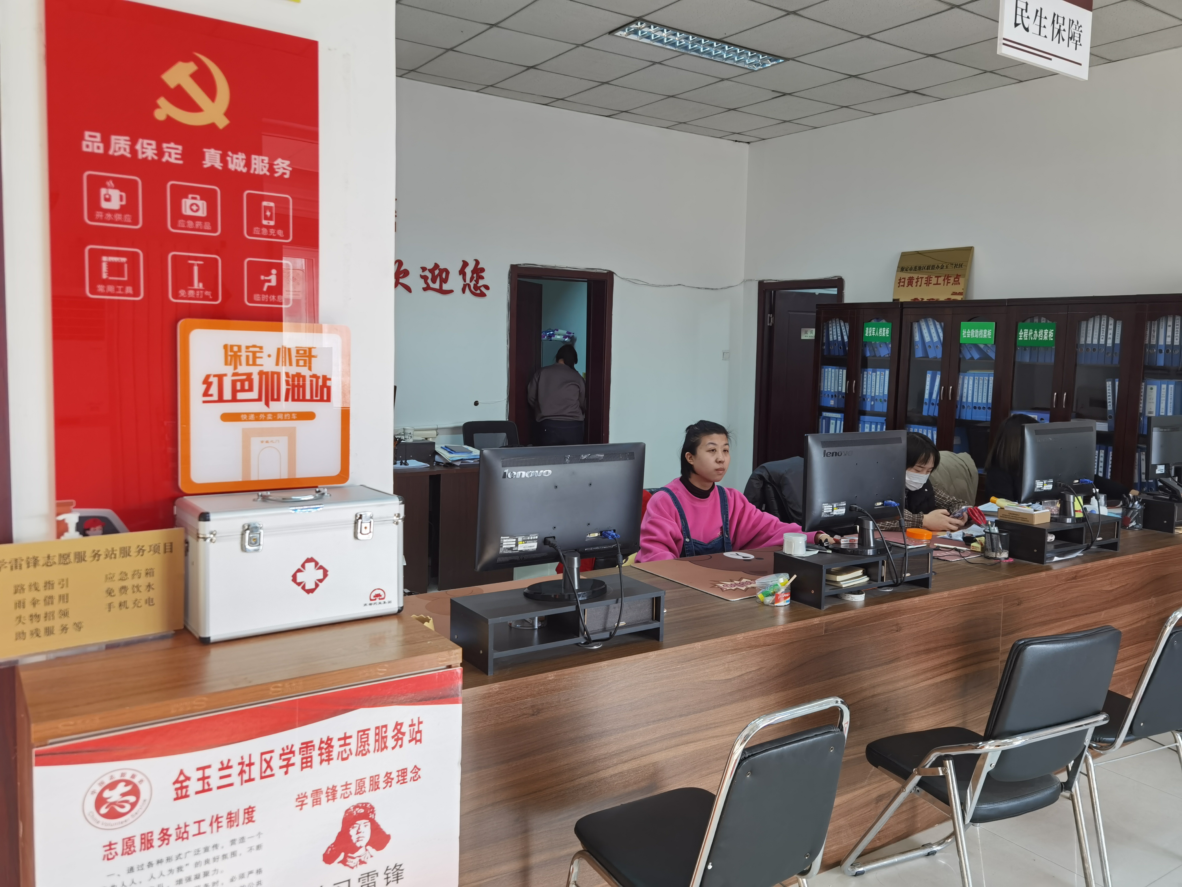 去年年底,经过申报评选,金玉兰社区设立了“保定·小哥红色加油站”。评选完成后,社区党总支书记邸晓霞就主动将这个好消息告知了社区附近三家快递站点负责人。渐渐的,来社区接水的快递小哥越来越多。