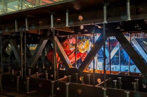 永定河特大桥东西横梁各分为10个拼装节段,其中两侧节段均与拱肋进行匹配拼装,对制造精度要求高。在制造过程中,中铁山桥发挥技术装备优势,严格管控质量。为保证工期,在项目现场组织多个工作面同时工作,24小时不间断,积极推进项目施工进度、质量控制等各方面工作建设,力争打造北京地区标杆工程。