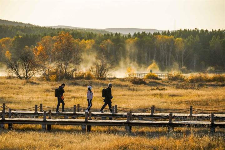 游客在河北省塞罕坝国家森林公园欣赏秋日晨景(2022年9月29日摄)。新华社发(刘满仓摄)