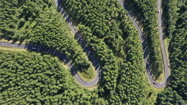 车辆在塞罕坝国家森林公园的道路上行驶(无人机照片)。新华社发(刘满仓摄)