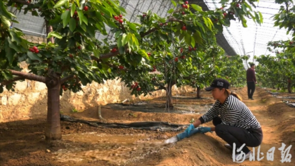 日前,山海关区石河镇望峪村大樱桃种植户在给樱桃树浇水。河北日报记者孙也达摄