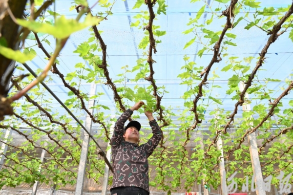 日前,昌黎县十里铺乡张各庄三村葡萄种植户在进行掐蔓、疏果等管理。河北日报记者孙也达摄