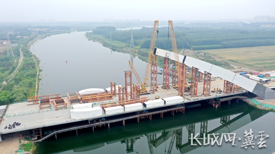 大厂回族自治县与北京城市副中心之间有一条潮白河,正在建设中的厂通路将两地更紧密地连为一体。当前,厂通路潮白河大桥主桥施工正在水中作业。整座大桥由40个大小不一的桥墩支撑,0号墩到26号墩在北京通州区境内,27号墩到39号墩在大厂回族自治县境内,两地同时推进、同标建设、由同一团队施工。