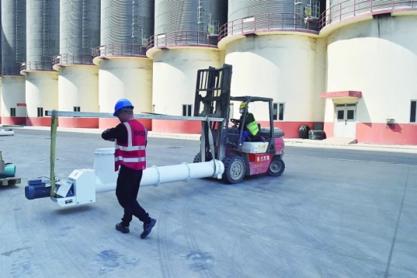在中粮面业(秦皇岛)鹏泰有限公司扩建年加工48万吨小麦项目的施工现场,建筑工人正在做厂房外立面的装修和内部设备的安装。运输材料和设备的货车进进出出,吊车将材料和设备有序地摆放归位。