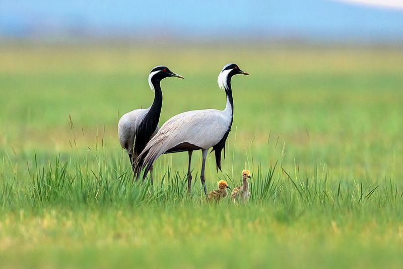 蓑羽鹤是大型涉禽、国家二级重点保护野生动物,属罕见珍稀鸟类,对生态环境质量要求很高,多栖息于开阔的平原、草地、沼泽、湿地、高原湖泊等地。除繁殖期成对活动外,多数时间它们小群或家族活动,在我国种群数量较少。