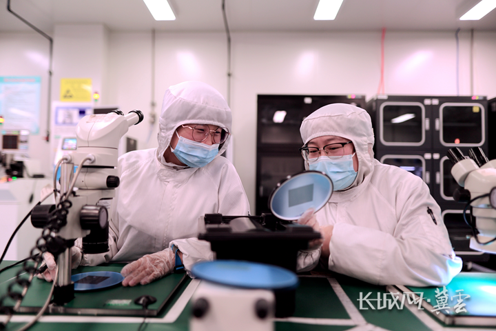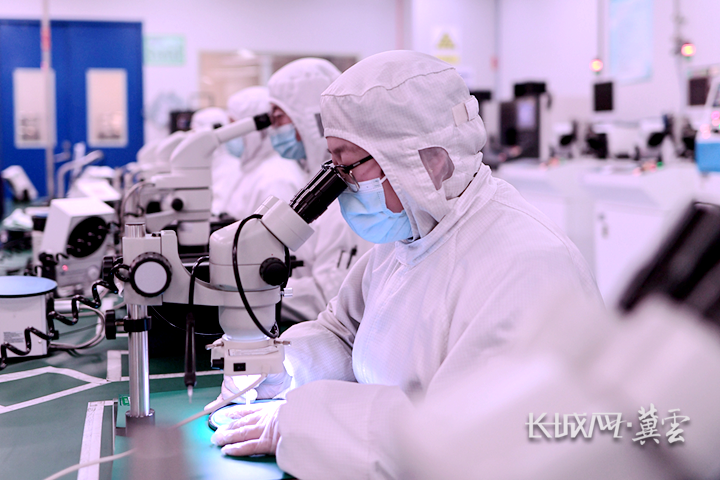 在生产车间,工程师们正在对芯片进行人工镜检。长城网·冀云客户端记者 袁立朋 摄