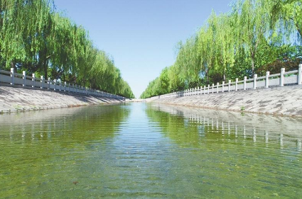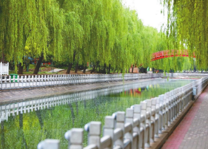 从河道右侧沿着石块铺砌的小路缓步向前,垂柳婆娑,婀娜多姿。绿水映照着蓝天白云,太阳光投进波光粼粼的水面,到处涌动着景泰蓝的色泽。天宁静深远,水清新淡雅,无忧无虑的孩子们在林间追逐嬉戏,太极拳爱好者在树荫下悠闲切磋,散步、赏花的人们徜徉在一派青翠中……莺在歌,人欢笑,鸟儿在嬉戏,和着望不尽的悠悠碧空,构成了一幅绝美的水墨画。