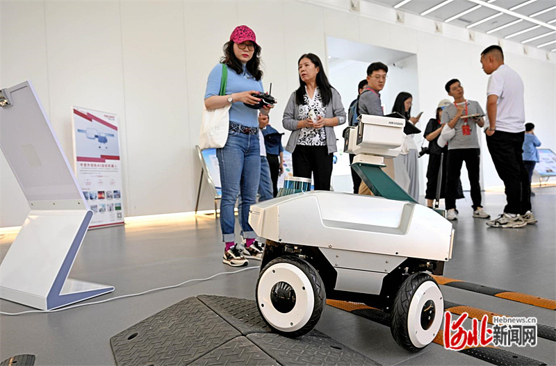 7月19日,参观人员在雄安新区科创中心中试基地(一期)体验操作轮式智能巡检机器人。河北日报记者张昊摄