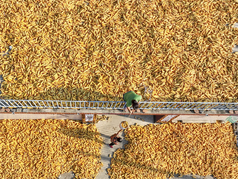 9月21日,遵化市刘备寨乡农民在场院晾晒玉米。新华社发(刘满仓摄)