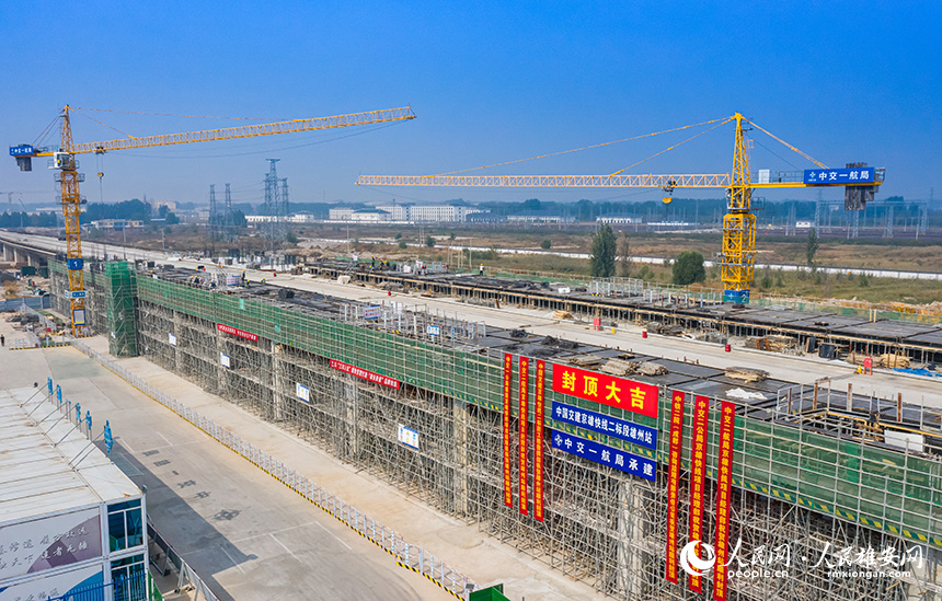 人民网雄安10月18日电 (记者宋烨文)日前,雄安新区至北京大兴国际机场快线项目(简称“京雄快线项目”)雄州站站房工程实现主体结构封顶,为全线顺利通车打下了坚实的基础,助推“轨道上的京津冀”加速形成。