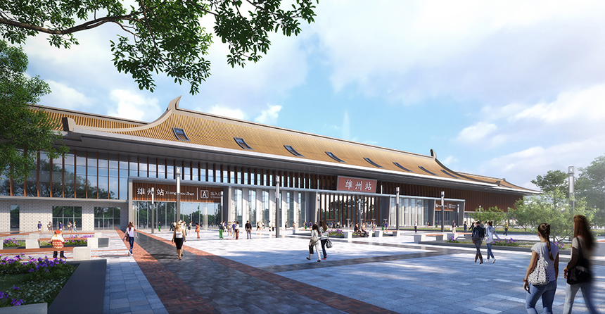 据介绍,雄州站总建筑面积约1.7万平方米,设计采用了“翼翼雄州”的主题,主体为站桥分离两层框架结构,地上两层高架车站,车站中间为越行线采用桥梁结构,两侧为到发线及站台层采用混凝土框架结构。地面一层为车站站厅层,地面二层为车站站台层,屋面罩棚采用钢结构,外立面为玻璃幕墙。