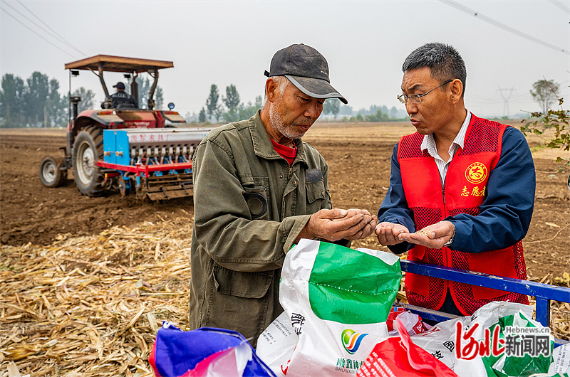 10月12日,涞水县农业农村局工作人员(右)在田间指导村民播种冬小麦。