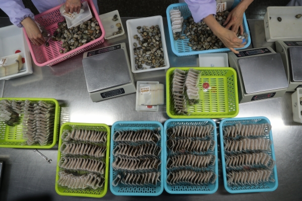 海东青食品有限公司的生产车间里,工人们正在分拣、包装杂色蛤。