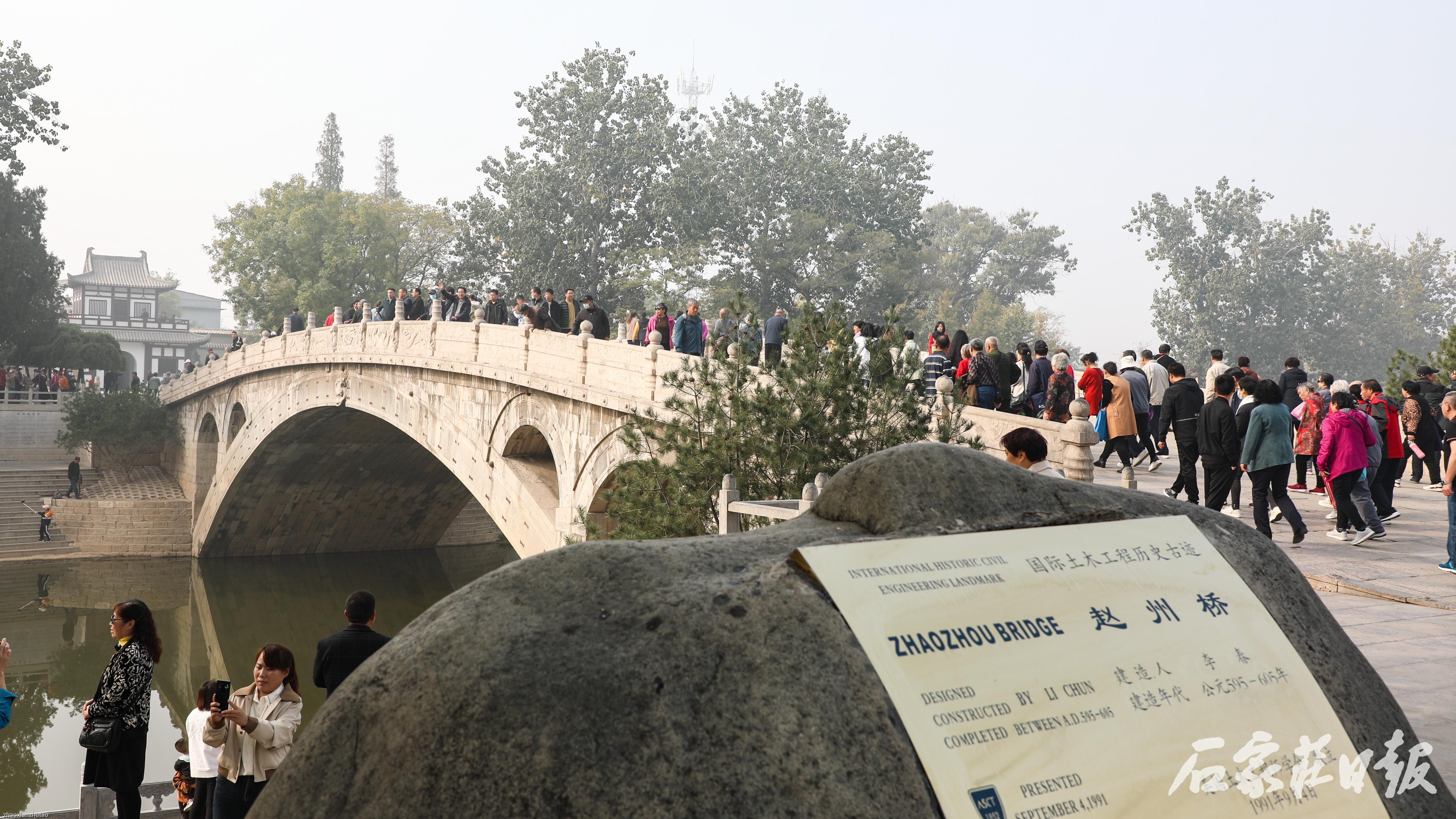 11月2日,免费开放的赵州桥景区,吸引了众多游客和市民前来游玩、打卡,景区内、大桥上,游客扶老携幼、举家出游,探秘千年古桥、感悟古人智慧。