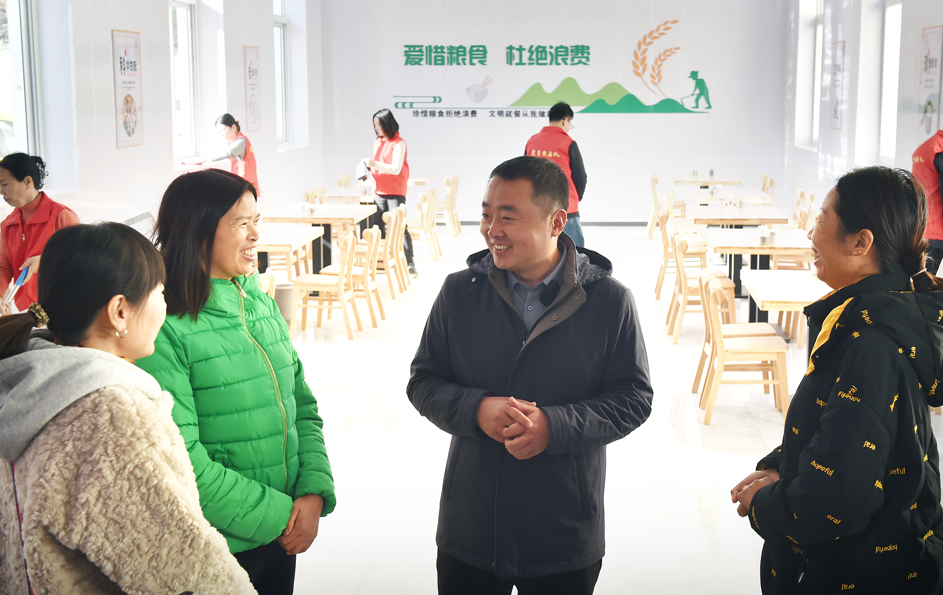 11月11日,涿州市双塔街道党工委书记姚贵滨(右二)向居民介绍即将开业的便民食堂。 河北日报记者 贾恒 摄