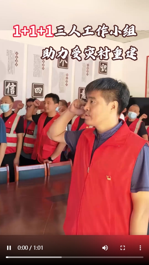 “1+1+1”三人工作小组,根据岗位特点,明确职责。市直干部主要负责统筹领导本村受灾重点户包联干部、市直灾后统计工作队工作开展,协调本村对接市直职能部门解决实际问题。镇干部主要负责安排指导本村工作开展,做好镇村沟通纽带,协调本村对接镇职能站所解决实际问题。村干部主要负责统筹领导本村其他村干部、党员开展包片、包户工作,动员群众开展灾后恢复重建,做好群众与市、镇沟通纽带。三人工作小组成员相互协助配合,发挥出了 1+1+1 大于 3的实际成效。