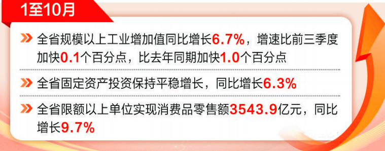 全省规模以上工业增加值同比增长6.7%,固定资产投资同比增长6.3%,限额以上单位实现消费品零售额同比增长9.7%……