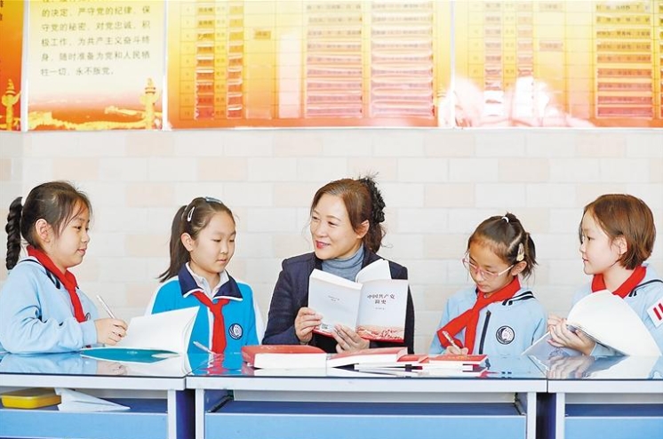 图为管道局中学第三附属小学大队辅导员组织少先队员学党史。记者 陈童 摄