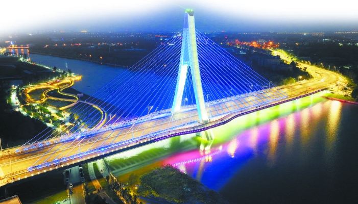 湛蓝的天空、碧绿的河水、乳白色的主塔、白色的斜拉索,学府路东延跨太平河桥——河北省单塔跨径最大的桥梁和102米高的主塔跨越在太平河上,蔚为壮观,已经成为石家庄一个新的地标性建筑。它的建成通车,实现了太平河的南北跨越,进一步畅通了区域交通循环。