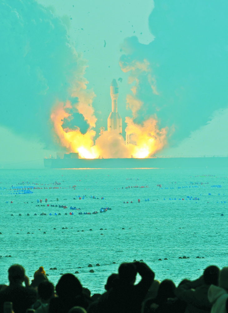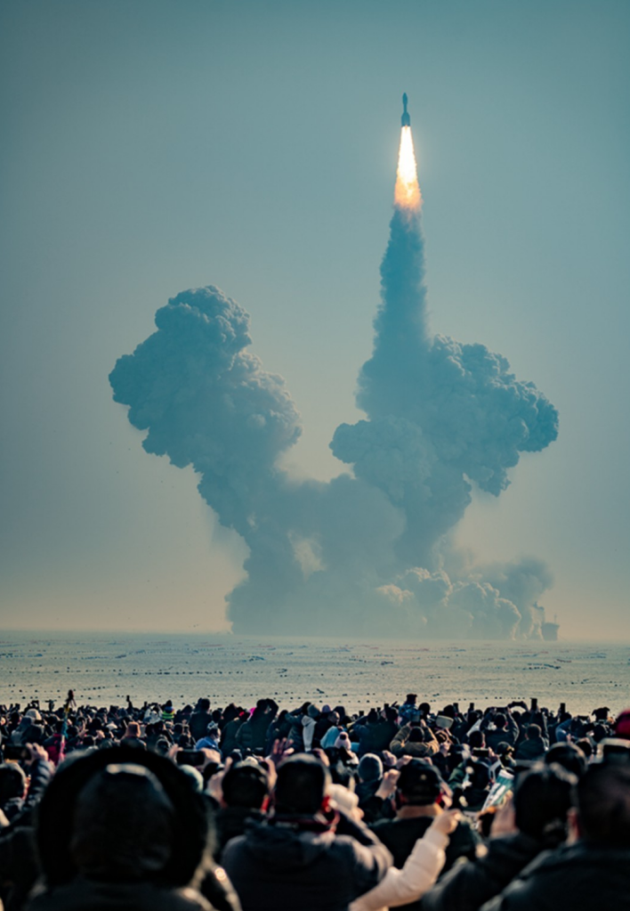 1月11日,人们在山东省海阳市连理岛上观看海上火箭发射。新华社记者 李紫恒 摄