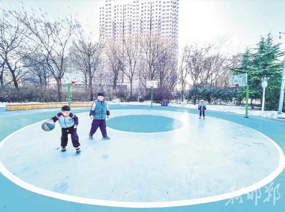 位于复兴区的邯郸体育公园里,篮球场上几个孩子正在兴高采烈地玩耍。