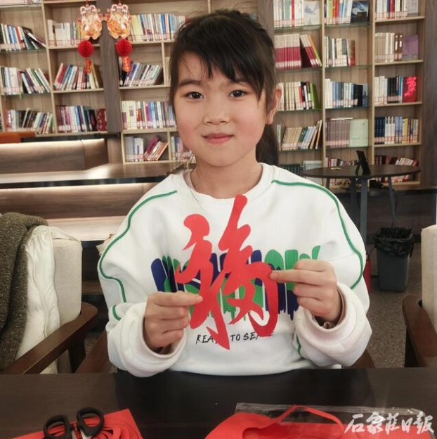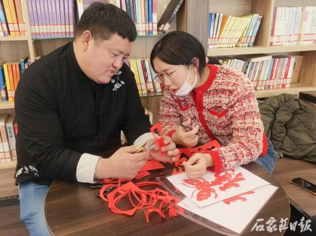 2月3日,在河北省图书馆“守正书房”里,行唐剪纸代表性传承人赵成龙手持一把小小的剪刀,灵活地在一张红纸上穿梭舞动,伴随着洋洋洒洒掉落的红纸片,一幅栩栩如生的剪纸作品便呈现在读者面前。