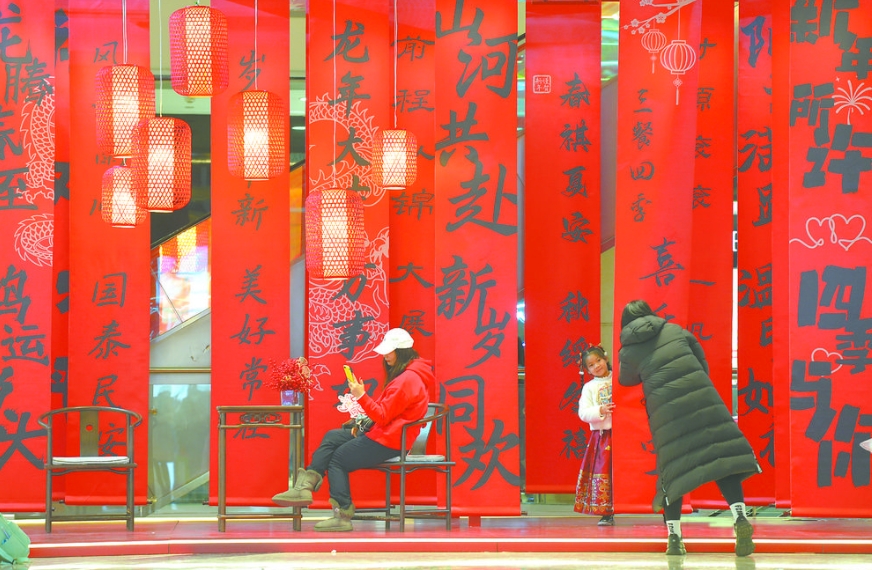 在用春联、书法等传统文化艺术元素布置的景观里,市民休闲玩耍,享受美好假期。