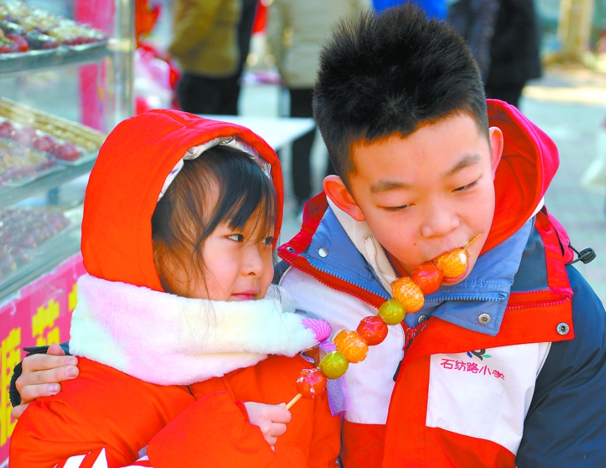兄妹俩在分享香甜的冰糖葫芦,感受传统小吃的味道。