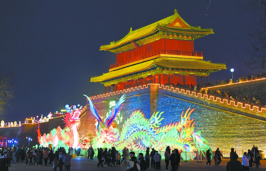 “咚咚咚”,鼓声铿锵。在正定古城,常山战鼓队的阵阵鼓声为龙年春节增添了更多热闹,鼓手们腾挪跳跃,鼓槌上下翻飞,彩绸飘舞,气势雄浑。夜幕降临之下,南城墙上的“正定古城灯会”也是一派热闹非凡的景象,近百米长的龙凤巨型灯组与城墙上的千盏花灯一同点亮,让古城的夜空璀璨夺目。龙年春节,正定古城打造了古城灯会、实景演出、艺术展演、非遗市集等新春胜景与文化盛宴,喜迎八方来客。