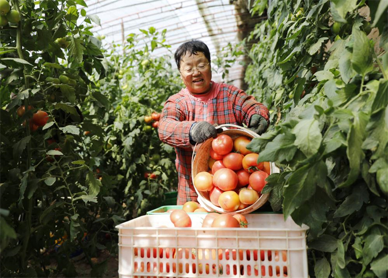 工作人员在固安县一个合作社的大棚内采摘西红柿。(固安县委宣传部供图)
