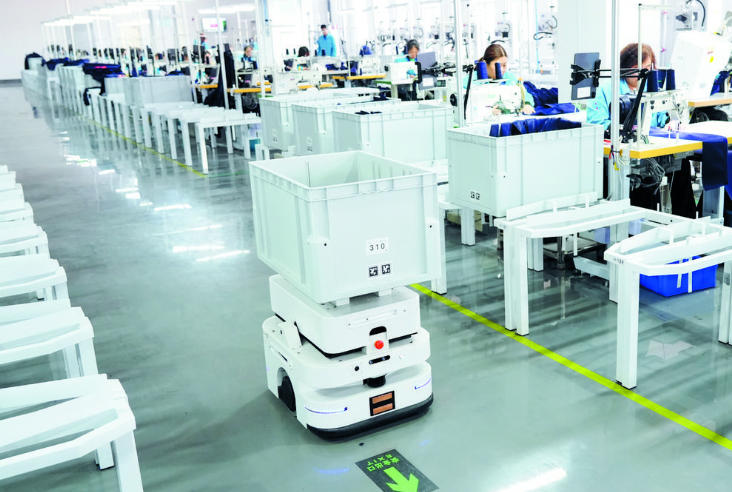 图为际华三五零二职业装有限公司无人衣料运送车。