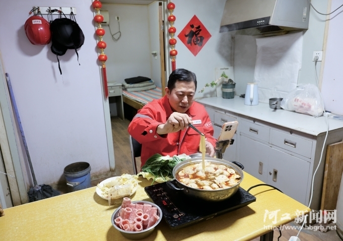 2月6日,于怀文在铁皮房内吃饺子。新春临近,吉兰泰采油作业项目部为值守井站的采油工送来了羊肉片和饺子。