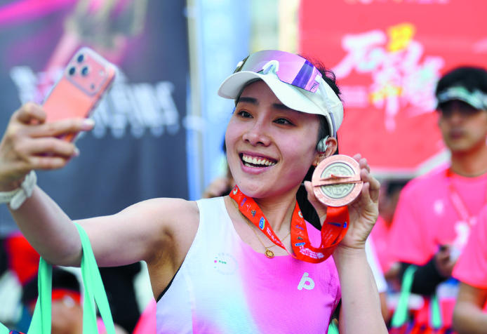 图为一名参赛选手赛后手持完赛奖牌自拍留念。  新华社发  (张晓峰 摄)