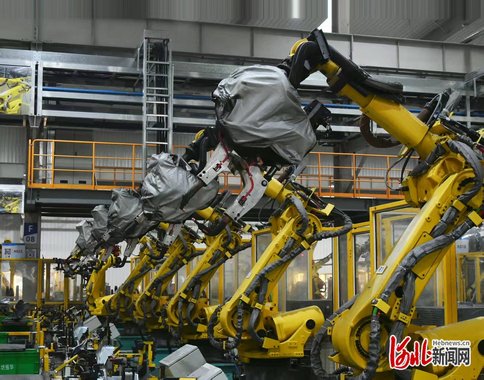 12日上午,记者刚一走进廊坊振华全京申汽车零部件有限公司的厂房,一股重金属气息就扑面而来:占地6万多平方米的车间内,预想中大量工人穿梭、物料挪移的忙碌景象并未出现,取而代之的画面宛如“科幻大片”——100多台黄色机器人正挥舞着机械臂按照预定编程进行焊接。焊枪的“嘶嘶”声应和着机械臂转动的低沉嗡鸣,在空旷的车间里回响。